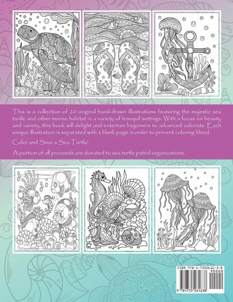 A lovely collection of 20 original hand-drawn illustrations featuring the majestic sea turtle and other marine animals in their tranquil habitats. With a focus on beauty and variety, this book will delight and entertain beginners to advanced colorists. Each unique illustration is separated with a blank page in order to prevent coloring bleed. Color and Save a Sea Turtle A portion of all proceeds are donated to sea turtle patrol organizations.