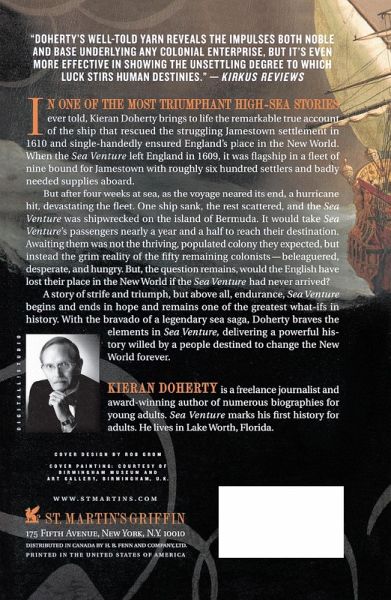 In one of the most triumphant high sea stories ever told, Kieran Doherty brings to life the remarkable true story of the ship that rescued the struggling Jamestown settlement in 1610 and single-handedly ensured England's place in the New World. When the Sea Venture left England in 1609, it was flagship in a fleet of nine bound for Jamestown with roughly 600 settlers and badly needed supplies aboard. But after four weeks at sea, as the voyage neared its end, a hurricane hit devastating the fleet-one ship sank, the rest scattered, and the Sea Venture was shipwrecked on the island of Bermuda. It would take Sea Venture's passengers nearly a year and half to reach their destination. Awaiting them was not the thriving, populated colony they expected, but instead the grim reality of a remaining fifty colonists-beleaguered, desperate, and hungry. But, the question remains, would the English have lost their place in the New World if the Sea Venture had never arrived? A story of strife and triumph, but above all, endurance, Sea Venture begins and ends in hope and remains one of the greatest "What Ifs?" in history. With the bravado of a legendary sea saga, Doherty braves the elements in Sea Venture, delivering a powerful history willed by a people destined to change the New World forever.