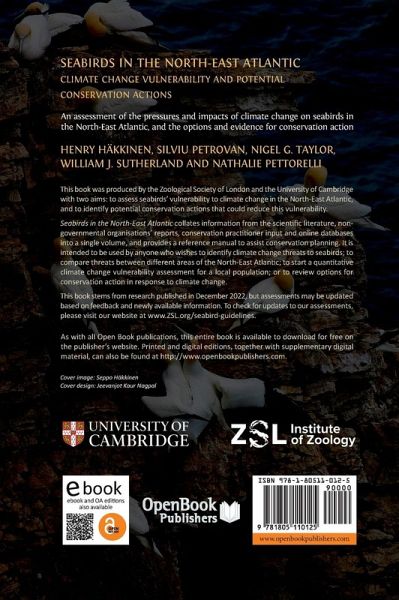 This book was produced by the Zoological Society of London and the University of Cambridge with two aims: to assess seabirds' vulnerability to climate change in the North-East Atlantic, and to identify potential conservation actions that could reduce this vulnerability. 'Seabirds in the North-East Atlantic' collates information from the scientific literature, non-governmental organisations' reports, conservation practitioner input and online databases into a single volume, and provides a reference manual to assist conservation planning. It is intended to be used by anyone who wishes to identify climate change threats to seabirds; to compare threats between different areas of the North-East Atlantic; to start a quantitative climate change vulnerability assessment for a local population; or to review options for conservation action in response to climate change. This book stems from research published in December 2022, but assessments may be updated based on feedback and newly available information. To check for updates to our assessments, please visit our website at: www.ZSL.org/seabird-guidelines.