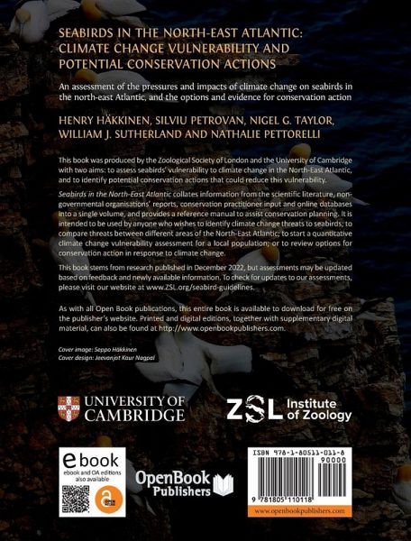 This book was produced by the Zoological Society of London and the University of Cambridge with two aims: to assess seabirds' vulnerability to climate change in the North-East Atlantic, and to identify potential conservation actions that could reduce this vulnerability. 'Seabirds in the North-East Atlantic' collates information from the scientific literature, non-governmental organisations' reports, conservation practitioner input and online databases into a single volume, and provides a reference manual to assist conservation planning. It is intended to be used by anyone who wishes to identify climate change threats to seabirds; to compare threats between different areas of the North-East Atlantic; to start a quantitative climate change vulnerability assessment for a local population; or to review options for conservation action in response to climate change. This book stems from research published in December 2022, but assessments may be updated based on feedback and newly available information. To check for updates to our assessments, please visit our website at: www.ZSL.org/seabird-guidelines.
