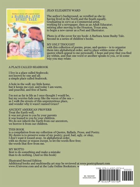 A few illustrations within this Revised Edition of: Seabrook, Texas, within a garden. A collection of poems, ballads, quotes, and prose about Seabrook, Texas, and the surrounding area near Houston, Texas, with garden poetry worked through out the book. An additional chapter has been added, and alphabetized for an easy read. There is also a bit of history in this versified book, with many different styles of poetry as well. A nice gift for anyone who likes poems about the sea, or garden poems.