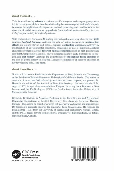 "Reviews specific enzymes and enzyme groups studied in recent years, delves into the relationship between enzymes and seafood quality, covers the application of enzymes as seafood processing aids, and focuses on the recovery of useful enzymes as by-products from seafood waste. Details the control of enzyme activity in seafood products."