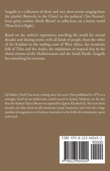 Seagulls is an eclectic collection of short, shorter and micro stories by GJ Maher which takes us from the refugee trails of Africa to Charles Dickens' country studio, from a monkey writing his first story to a jetty somewhere in coastal Australia where they sell, of all things, ideas. From politics to travel, word games to love poems, campfire conversations to polemic - if you're a sucker for exotic locations and unexpected encounters, this is the collection for you. GJ Maher draws on a rich lifetime of travel to exotic locations, conversations with unusual people, and a strong sense of compassion and justice in these diverse tales, anecdotes and opinion pieces.