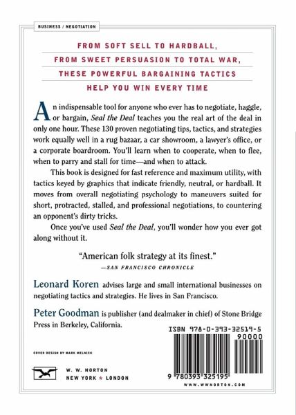 An indispensable tool for anyone who ever has to negotiate, haggle, or bargain, Seal the Deal teaches you the real art of the deal in only one hour. These 130 proven negotiating tips, tactics, and strategies work equally well in a rug bazaar, a car showroom, a lawyer's office, or a corporate boardroom. You'll learn when to cooperate, when to flee, when to parry and stall for time-and when to attack. This book is designed for fast reference and maximum utility, with tactics keyed by graphics that indicate friendly, neutral, or hardball. It moves from overall negotiating psychology to maneuvers suited for short, protracted, stalled, and professional negotiations, to countering an opponent's dirty tricks. Once you've used Seal the Deal, you'll wonder how you ever got along without it. Originally published as The Haggler's Handbook.