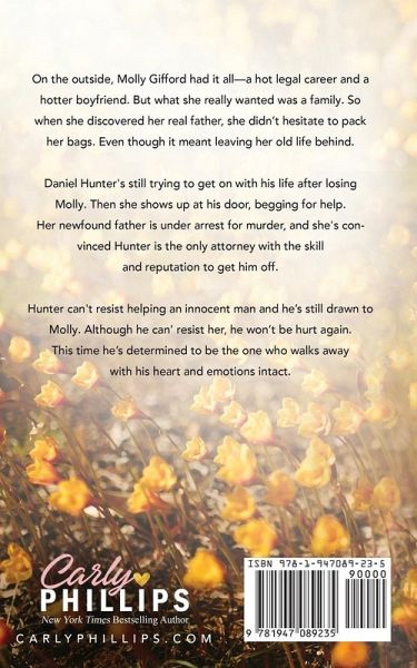 On the outside, Molly Gifford had it all-a hot legal career and a hotter boyfriend. But what she really wanted was a family. So when she discovered her real father, she didn't hesitate to pack her bags. Even though it meant leaving her old life behind. Daniel Hunter's still trying to get on with his life after losing Molly. Then she shows up at his door, begging for help. Her newfound father is under arrest for murder, and she's convinced Hunter is the only attorney with the skill and reputation to get him off. Hunter can't resist helping an innocent man and he's still drawn to Molly. Although he can't resist her, he won't be hurt again. This time he's determined to be the one who walks away with his heart and emotions intact.