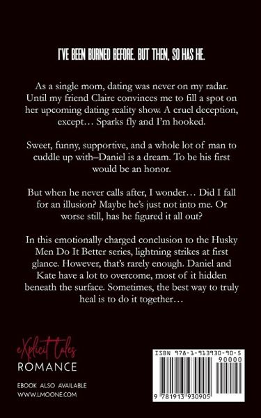 I've been burned before. But then, so has he. As a single mom, dating was never on my radar. Until my friend Claire convinces me to fill a spot on her upcoming dating reality show. A cruel deception, except... Sparks fly and I'm hooked. Sweet, funny, supportive, and a whole lot of man to cuddle up with-Daniel is a dream. To be his first would be an honor. But when he never calls after, I wonder... Did I fall for an illusion? Maybe he's just not into me. Or worse still, has he figured it all out? In this emotionally charged conclusion to the Husky Men Do It Better series, lightning strikes at first glance. However, that's rarely enough. Daniel and Kate have a lot to overcome, most of it hidden beneath the surface. Sometimes, the best way to truly heal is to do it together...