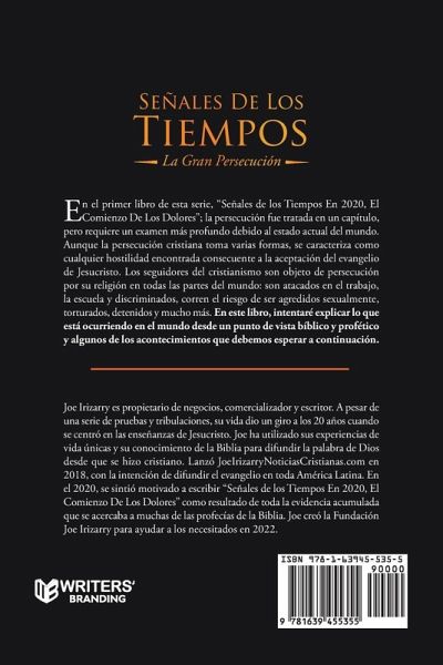 En el primer libro de esta serie, "Señales de los Tiempos En 2020, El Comienzo De Los Dolores"; la persecución fue tratada en un capítulo, pero requiere un examen más profundo debido al estado actual del mundo. Aunque la persecución cristiana toma varias formas, se caracteriza como cualquier hostilidad encontrada consecuente a la aceptación del evangelio de Jesucristo. Los seguidores del cristianismo son objeto de persecución por su religión en todas las partes del mundo: son atacados en el trabajo, la escuela y discriminados, corren el riesgo de ser agredidos sexualmente, torturados, detenidos y mucho más. En este libro, intentaré explicar lo que está ocurriendo en el mundo desde un punto de vista bíblico y profético y algunos de los acontecimientos que debemos esperar a continuación. Joe Irizarry es propietario de negocios, comercializador y escritor. A pesar de una serie de pruebas y tribulaciones, su vida dio un giro a los 20 años cuando se centró en las enseñanzas de Jesucristo. Joe ha utilizado sus experiencias de vida únicas y su conocimiento de la Biblia para difundir la palabra de Dios desde que se hizo cristiano. Lanzó JoeIrizarryNoticiasCristianas.com en 2018, con la intención de difundir el evangelio en toda América Latina. En el 2020, se sintió motivado a escribir "Señales de los Tiempos En 2020, El Comienzo De Los Dolores" como resultado de toda la evidencia acumulada que se acercaba a muchas de las profecías de la Biblia. Joe creó la Fundación Joe Irizarry para ayudar a los necesitados en 2022.