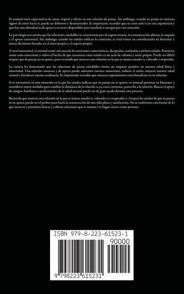 Es normal tener expectativas de amor, respeto y afecto en una relación de pareja. Sin embargo, cuando tu pareja no muestra signos de amor hacia ti, puede ser doloroso y desorientador. Es importante recordar que no estás solo/a en esta experiencia y que hay una abundancia de apoyo y recursos disponibles para ayudarte a navegar por esta situación. La psicología nos enseña que las relaciones saludables se caracterizan por el respeto mutuo, la comunicación abierta, la empatía y el apoyo emocional. Sin embargo, cuando las señales indican lo contrario, es vital tomar en consideración tu bienestar y tomar decisiones basadas en el amor propio y el respeto propio. A nivel emocional, es normal sentir una mezcla de emociones como tristeza, decepción, confusión e incluso enfado. Permítete sentir estas emociones y valora el hecho de que reconocer estas señales es un acto de valentía y amor propio. Puede ser difícil aceptar que tu pareja no te quiere, pero recuerda que mereces una relación en la que te sientas amado/a, valorado y respetado. La ciencia ha demostrado que las relaciones de pareja saludables tienen un impacto positivo en nuestra salud física y emocional. Una relación amorosa y de apoyo puede aumentar nuestra autoestima, reducir el estrés, mejorar nuestra salud mental y fortalecer nuestra resiliencia. Es importante recordar que mereces experimentar estos beneficios en tu relación. Si te encuentras en una situación en la que las señales indican que tu pareja no te quiere, es esencial priorizar tu bienestar y considerar tomar medidas para cambiar la dinámica de la relación o, en casos extremos, poner fin a la relación. Buscar el apoyo de amigos, familiares o profesionales de la salud mental puede ser de gran ayuda durante este proceso. Recuerda que mereces una relación en la que te sientas amado/a, valorado/a y respetado/a. Aceptar las señales de que tu pareja no te quiere puede ser el primer paso hacia la construcción de una vida plena y satisfactoria. No te conformes con menos de lo que mereces y permítete buscar y cultivar relaciones que te nutran y te hagan crecer como persona.