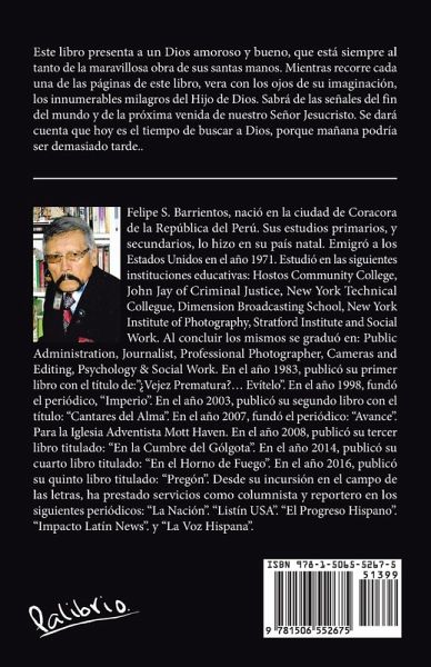 Este libro presenta a un Dios amoroso y bueno, que está siempre al tanto de la maravillosa obra de sus santas manos. Mientras recorre cada una de las páginas de este libro, vera con los ojos de su imaginación, los innumerables milagros del Hijo de Dios. Sabrá de las señales del fin del mundo y de la próxima venida de nuestro Señor Jesucristo. Se dará cuenta que hoy es el tiempo de buscar a Dios, porque mañana podría ser demasiado tarde..