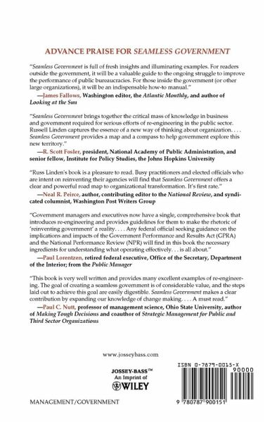 Seamless Government tells how to re-engineer government agencies to meet the needs of its customers "seamlessly" that is, in a smooth, effortless, responsive manner. The author details a step-by-step approach for re-engineering in all levels of government, explaining how to assess, design, and implement radical changes in the way government does business-and how to overcome resistance along the way. "Full of fresh insights and illuminating examples. For readers outside the government, it will be a valuable guide to the ongoing struggle to improve the performance of public bureaucracies. For those inside the government (or other large organizations), it will be an indispensable how-to manual."-James Fallows, Washington editor, The Atlantic Monthly