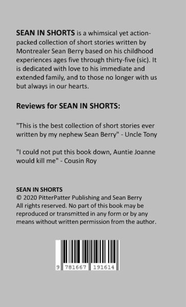 SEAN IN SHORTS is a whimsical yet action-packed collection of short stories written by Montrealer Sean Berry based on his childhood experiences ages five through thirty-five (sic). The fast-paced stories are fictitious adaptations of real-life events and people. From his early days roaming the beaches and waters of Barbados as an unsupervised nine year old to bumper-hitching on the back of Montreal city buses at twelve, Sean's somewhat precarious childhood was filled with adventure, danger and its fair share of heartwarming events and characters. In terms of subject matter and content, there are a few minor injuries but no real violence and swearing is used on occasion throughout. Parental discretion is advised.
