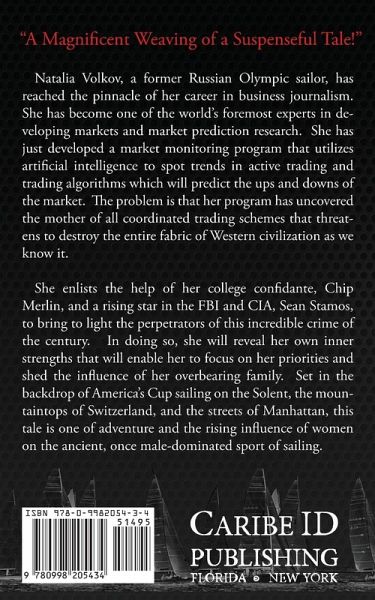Natalia Volkov, a former Russian Olympic sailor, has reached the pinnacle of her career in business journalism. She has become one of the world's foremost experts in developing markets and market prediction research. She has just developed a market monitoring program that utilizes artificial intelligence to spot trends in active trading and trading algorithms which will predict the ups and downs of the market. The problem is that her program has uncovered the mother of all coordinated trading schemes that threatens to destroy the entire fabric of Western civilization as we know it. She enlists the help of her college confidante, Chip Merlin, and a rising star in the FBI and CIA, Sean Stamos, to bring to light the perpetrators of this incredible crime of the century. In doing so, she will reveal her own inner strengths that will enable her to focus on her priorities and shed the influence of her overbearing family. Set in the backdrop of America's Cup sailing on the Solent, the mountaintops of Switzerland, and the streets of Manhattan, this tale is one of adventure and the rising influence of women on the ancient, once male-dominated sport of sailing.