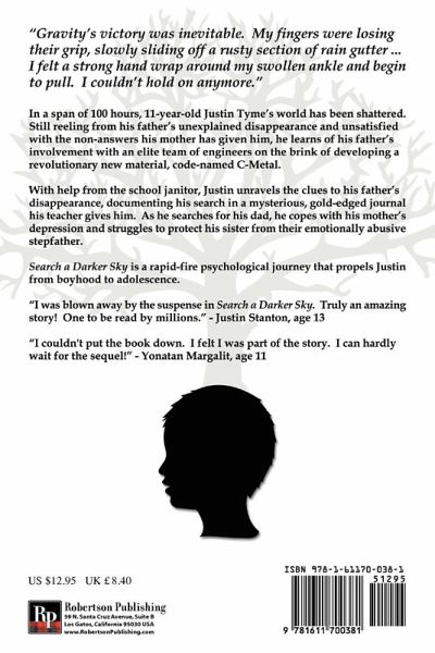 "Gravity's victory was inevitable. My fingers were losing their grip, slowly sliding off a rusty section of rain gutter... I felt a strong hand wrap around my swollen ankle and begin to pull. I couldn't hold on anymore." In a span of 100 hours, 11-year-old Justin Tyme's world has been shattered. Still reeling from his father's unexplained disappearance and unsatisfied with the non-answers his mother has given him, he learns of his father's involvement with an elite team of engineers on the brink of developing a revolutionary new material, code-named C-Metal. With help from the school janitor, Justin unravels the clues to his father's disappearance, documenting his search in a mysterious, gold-edged journal his teacher gives him. As he searches for his dad, he copes with his mother's depression and struggles to protect his sister from their emotionally abusive stepfather. Search a Darker Sky is a rapid-fire psychological journey that propels Justin from boyhood to adolescence. "I was blown away by the suspense in Search a Darker Sky. Truly an amazing story! One to be read by millions." -Justin Stanton, age 13 "I couldn't put the book down. I felt I was part of the story. I can hardly wait for the sequel!" -Yonatan Margalit, age 11 The Author: As a kid, Devik Schreiner had a bad haircut and wore his pants too short. He enjoyed reading almanacs, science fiction, and the backs of baseball cards. He plays the trumpet and piano, loves golf and the San Francisco Giants, and is known for balancing a pencil on his nose. Devik teaches middle school English and History in San Jose and lives in Los Gatos, California with his wife and twin girls.