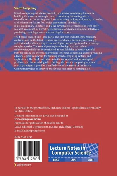 Search computing, which has evolved from service computing, focuses on building the answers to complex search queries by interacting with a constellation of cooperating search services, using ranking and joining of results as the dominant factors for service composition. The field is multi-disciplinary in nature, and takes advantage of contributions from other research areas such as knowledge representation, human-computer interfaces, psychology, sociology, economics and legal sciences.The book is divided into three parts. The first part includes some visionary contributions on the latest trends in search, which is becoming increasingly task-oriented and is starting to use ontological knowledge in order to manage complex queries. The second part explores background and related technologies, which can be considered as parallel fields of research, useful both for setting the theoretical premises for search computing and for providing a technological framework for building search computing systems and applications. The third part delves into the conceptual and technological problems and issues arising when dealing with search computing as a new search paradigm. It provides a unified view of the results of the Search Computing project as achieved exactly one year after its starting date.