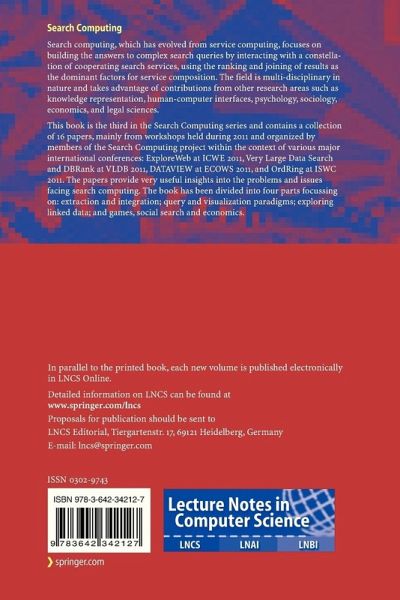 Search computing, which has evolved from service computing, focuses on building the answers to complex search queries by interacting with a constellation of cooperating search services, using the ranking and joining of results as the dominant factors for service composition. The field is multi-disciplinary in nature and takes advantage of contributions from other research areas such as knowledge representation, human-computer interfaces, psychology, sociology, economics, and legal sciences. This book is the third in the Search Computing series and contains a collection of 16 papers, which in most cases were contributed to several workshops during 2011 organized by members of the Search Computing project in the context of major international conferences: ExploreWeb at ICWE 2011, Very Large Data Search and DBRank at VLDB 2011, DATAVIEW at ECOWS 2011, and OrdRing at ISWC 2011. The papers provide very useful insights on search computing problems and issues. The book has been divided into four parts focussing on: extraction and integration; query and visualization paradigms; exploring linked data; and games, social search and economics.
