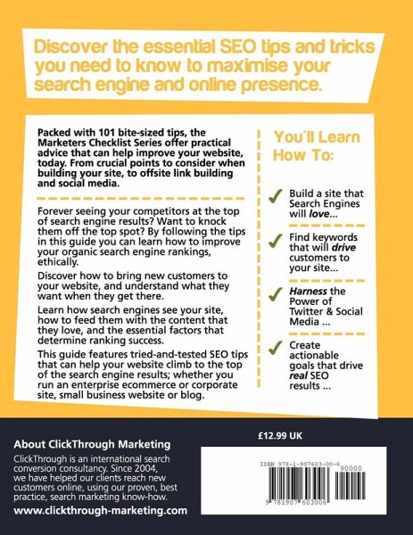 Forever seeing your competitors at the top of search engine results? Want to knock them off the top spot? By following the tips in this guide you can learn how to improve your organic search engine rankings,ethically. Discover how to bring new customers to your website, and understand what they want when they get there. Learn how search engines see your site, how to feed them with the content that they love, and the essential factors that determine ranking success. Packed with 101 bite-sized tips, the Marketers Checklist Series offer practical advice that can help improve your website, today. From crucial points to consider when building your site, to offsite link building and social media.