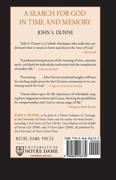 A Search for God in Time and Memory is an experiment in religious thought. While Catholic in scope and in historical perspective, it bypasses religious authority and official documents to find its sources in the life experiences of individuals. "It is a search," says John S. Dunne, "which will carry us on quests and journeys through life stories, through hells, purgatories and heavens, through ages of life, through stories of God." The quest begins with an examination of one's own life, with an awareness of patterns of its past and the contingencies of its future. The point of individual departure then is to seek comparison and perspective from the lives of great writers and philosophers, finding resonances between their lives and one's own and returning at last to one's own standpoint. It is in this process of "passing over" that one discovers the greater dimensions of man, those which reach beyond the self and the individual life story. This process is ultimately how man "brings time to mind, how he searches through time and memory, for passing over avails him of the time and memory of others, and coming back leaves his own time and memory enriched." In analyzing the stages of life-childhood, youth, manhood, and age-as they appear in modern autobiography, he discovers beneath these life experiences the possibilities of companionship with God in time and "the face underlying all, that of the compassionate God and the Compassionate Savior."