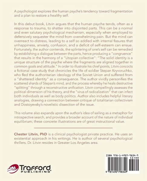 A psychologist explores the human psyche's tendency toward fragmentation and a plan to restore a healthy self. In this debut book, Litvin argues that the human psyche tends, often as a response to trauma, to shatter into disjointed parts. This can be a normal and even salutary psychological mechanism, especially when employed to defensively sequester the mind from overwhelming pain. But the mind can overreact to distress, leading to a self so addled with internal fissures that unhappiness, anxiety, confusion, and a deficit of self-esteem can ensue. Fortunately, the author contends, the splintering of one's self can be remedied by establishing a dialogue between the parts, hence producing a "congruence" that results in the harmony of a "Utopian collective": "The solid identity is a unique structure of the psyche where the fragments are aligned together in common goals and attitude." In order to illustrate his chief points, Litvin concocts a fictional case study that chronicles the life of soldier Stepan Kryvoruchko, who fled the authoritarian ideology of the Soviet Union and suffered from a "shattered identity" as a consequence. The author vividly personifies the scattered shards of Stepan's mind, and the process whereby he heals destructive "splitting" through a reconstructive unification. Litvin compellingly assesses the political dimension of his theory, and the "virus of radicalization" that can infect both individuals as well as body politics. Author also includes helpful literary analogies, drawing a connection between critique of totalitarian collectivism and Dostoyevsky's novelistic dissection of the issue. This volume also expands upon the author's idea of sailing as a metaphor for introspective search, and provides a broader account of the nature of individual equilibrium; these concrete illustrations are of great instructional value.