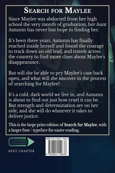 Since Maylee was abducted from her high school the very month of graduation, her Aunt Autumn has never lost hope in finding her. It's been three years. Autumn has finally reached inside herself and found the courage to track down an old lead, and travels across the country to find more clues about Maylee's disappearance. But will she be able to pry Maylee's case back open, and what will she uncover in the process of searching for Maylee? It's a cold, dark world we live in, and Autumn is about to find out just how cruel it can be. But strength and determination are on her side, and she will do whatever it takes to deliver justice. This is the large print edition of Search for Maylee, with a larger font / typeface for easier reading.