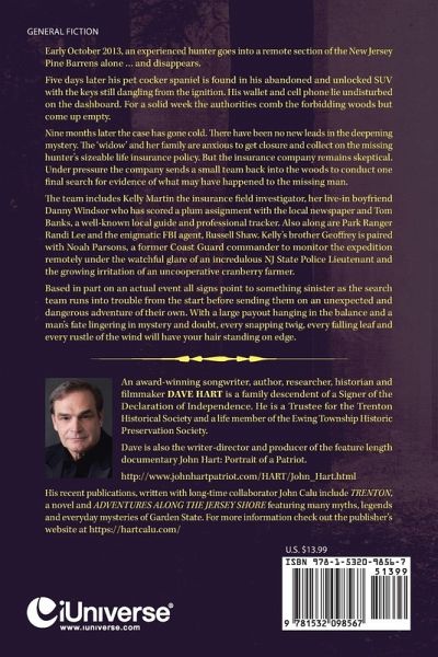 Early October 2013, an experienced hunter goes into a remote section of the New Jersey Pine Barrens alone ... and disappears. Five days later his pet cocker spaniel is found in his abandoned and unlocked SUV with the keys still dangling from the ignition. His wallet and cell phone lie undisturbed on the dashboard. For a solid week the authorities comb the forbidding woods but come up empty. Nine months later the case has gone cold. There have been no new leads in the deepening mystery. The 'widow' and her family are anxious to get closure and collect on the missing hunter's sizeable life insurance policy. But the insurance company remains skeptical. Under pressure the company sends a small team back into the woods to conduct one final search for evidence of what may have happened to the missing man. The team includes Kelly Martin the insurance field investigator, her live-in boyfriend Danny Windsor who has scored a plum assignment with the local newspaper and Tom Banks, a well-known local guide and professional tracker. Also along are Park Ranger Randi Lee and the enigmatic FBI agent, Russell Shaw. Kelly's brother Geoffrey is paired with Noah Parsons, a former Coast Guard commander to monitor the expedition remotely under the watchful glare of an incredulous NJ State Police Lieutenant and the growing irritation of an uncooperative cranberry farmer. Based in part on an actual event all signs point to something sinister as the search team runs into trouble from the start before sending them on an unexpected and dangerous adventure of their own. With a large payout hanging in the balance and a man's fate lingering in mystery and doubt, every snapping twig, every falling leaf and every rustle of the wind will have your hair standing on edge.