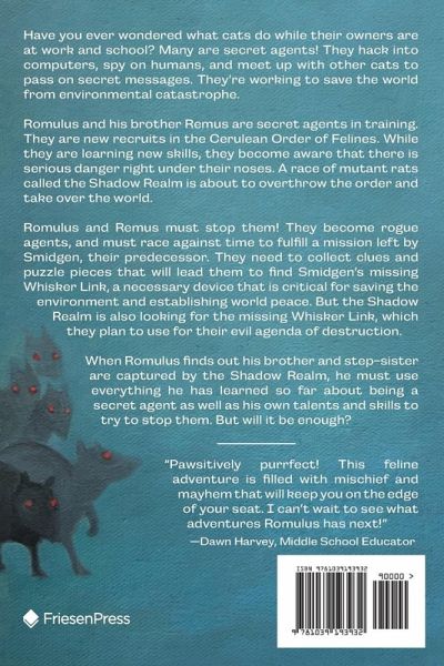 Have you ever wondered what cats do while their owners are at work and school? Many are secret agents! They hack into computers, spy on humans, and meet up with other cats to pass on secret messages. They're working to save the world from environmental catastrophe. Romulus and his brother Remus are secret agents in training. They are new recruits in the Cerulean Order of Felines. While they are learning new skills, they become aware that there is serious danger right under their noses. A race of mutant rats called the Shadow Realm is about to overthrow the order and take over the world. Romulus and Remus must stop them! They become rogue agents, and must race against time to fulfill a mission left by Smidgen, their predecessor. They need to collect clues and puzzle pieces that will lead them to find Smidgen's missing Whisker Link, a necessary device that is critical for saving the environment and establishing world peace. But the Shadow Realm is also looking for the missing Whisker Link, which they plan to use for their evil agenda of destruction. When Romulus finds out his brother and step-sister are captured by the Shadow Realm, he must use everything he has learned so far about being a secret agent as well as his own talents and skills to try to stop them. But will it be enough? "Pawsitively purrfect! This feline adventure is filled with mischief and mayhem that will keep you on the edge of your seat. I can't wait to see what adventures Romulus has next!" -Dawn Harvey, Middle School Educator