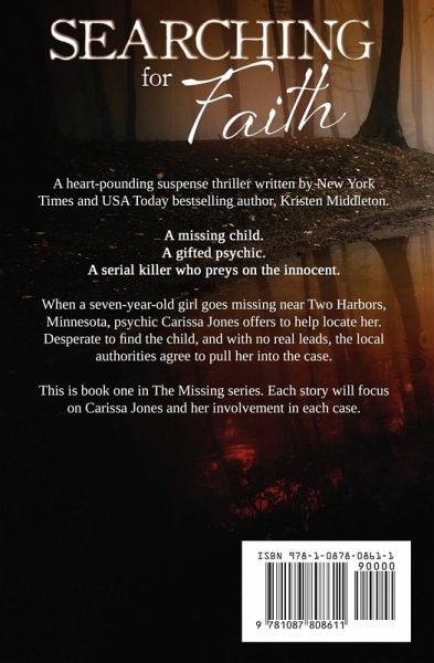 A missing child. A gifted psychic. A serial killer on the hunt. When a seven-year-old girl goes missing near Two Harbors, Minnesota, psychic Carissa Jones offers to help locate her. Desperate to find the child, and with no real leads, the local authorities agree to pull her into the case.
