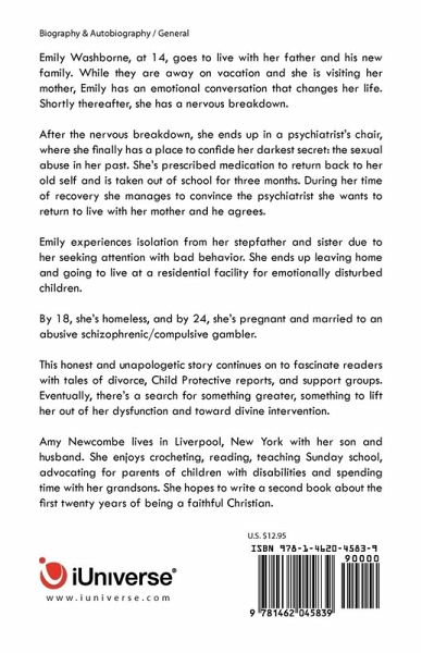 Emily Washborne, at 14, goes to live with her father and his new family. While they are away on vacation and she is visiting her mother, Emily has an emotional conversation that changes her life. Shortly thereafter, she has a nervous breakdown. After the nervous breakdown, she ends up in a psychiatrist's chair, where she finally has a place to confide her darkest secret: the sexual abuse in her past. She's prescribed medication to return back to her old self and is taken out of school for three months. During her time of recovery she manages to convince the psychiatrist she wants to return to live with her mother and he agrees. Emily experiences isolation from her stepfather and sister due to her seeking attention with bad behavior. She ends up leaving home and going to live at a residential facility for emotionally disturbed children. By 18, she's homeless, and by 24, she's pregnant and married to an abusive schizophrenic/compulsive gambler. This honest and unapologetic story continues on to fascinate readers with tales of divorce, Child Protective reports, and support groups. Eventually, there's a search for something greater, something to lift her out of her dysfunction and toward divine intervention.