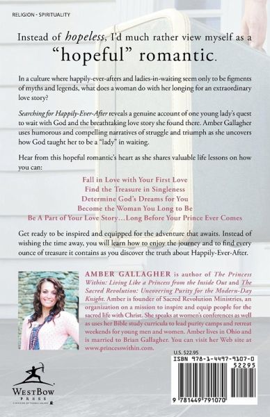 Instead of hopeless, I’d much rather view myself as a "hopeful" romantic. In a culture where happily-ever-afters and ladies-in-waiting seem only to be figments of myths and legends, what does a woman do with her longing for an extraordinary love story? Searching for Happily-Ever-After reveals a genuine account of one young lady’s quest to wait with God and the breathtaking love story she found there. Amber Gallagher uses humorous and compelling narratives of struggle and triumph as she uncovers how God taught her to be a "lady" in waiting. Hear from this hopeful romantic’s heart as she shares valuable life lessons on how you can: Fall in Love with Your First Love Find the Treasure in Singleness Determine God’s Dreams for You Become the Woman You Long to Be Be A Part of Your Love Story…Long Before Your Prince Ever Comes Get ready to be inspired and equipped for the adventure that awaits. Instead of wishing the time away, you will learn how to enjoy the journey and to find every ounce of treasure it contains as you discover the truth about Happily-Ever-After.