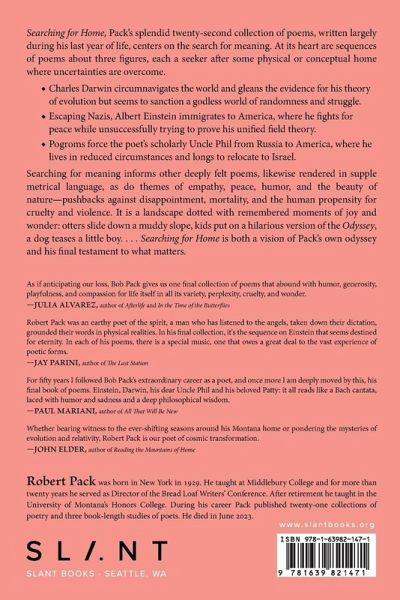 Searching for Home, Pack's splendid twenty-second collection of poems, written largely during his last year of life, centers on the search for meaning. At its heart are sequences of poems about three figures, each a seeker after some physical or conceptual home where uncertainties are overcome. · Charles Darwin circumnavigates the world and gleans the evidence for his theory of evolution but seems to sanction a godless world of randomness and struggle. · Escaping Nazis, Albert Einstein immigrates to America, where he fights for peace while unsuccessfully trying to prove his unified field theory. · Pogroms force the poet's scholarly Uncle Phil from Russia to America, where he lives in reduced circumstances and longs to relocate to Israel. Searching for meaning informs other deeply felt poems, likewise rendered in supple metrical language, as do themes of empathy, peace, humor, and the beauty of nature-pushbacks against disappointment, mortality, and the human propensity for cruelty and violence. It is a landscape dotted with remembered moments of joy and wonder: otters slide down a muddy slope, kids put on a hilarious version of The Odyssey, a dog teases a little boy. . . . Searching for Home is both a vision of Pack's own odyssey and his final testament to what matters.