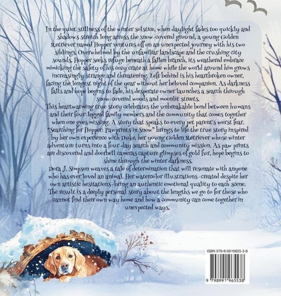 In the quiet stillness of the winter solstice, when daylight fades too quickly and shadows stretch long across the snow-covered ground, a young Golden Retriever named Hopper ventures off on an unexpected journey with his two siblings. Overwhelmed by the unfamiliar landscape and the crushing city sounds, Hopper seeks refuge beneath a fallen branch, its weathered embrace mimicking the safety of his cozy crate at home while the world around him grows increasingly strange and threatening. Left behind is his heartbroken owner, facing the longest night of the year without her beloved companion. As darkness falls and hope begins to fade, his desperate owner launches a search through snow-covered woods and moonlit streets. This heartwarming true story celebrates the unbreakable bond between humans and their four-legged family members and the community that comes together when one goes missing. A story that speaks to every pet parent's worst fear. Searching for Hopper: Pawprints in Snow brings to life the true story inspired by her own experience with Duke, her young Golden Retriever whose winter adventure turns into a four-day search and community mission. As paw prints are discovered and doorbell cameras capture glimpses of gold fur, hope begins to shine through the winter darkness. Dora J. Simpson weaves a tale of determination that will resonate with anyone who has ever loved an animal. Her watercolor illustrations-created despite her artistic hesitations-bring an authentic emotional quality to each scene. The result is a deeply personal story about the lengths we go to for those who cannot find their own way home and how a community can come together in unexpected ways. Perfect for young animal lovers ages 6-9, this heartwarming picture book offers gentle lessons about perseverance, community kindness, and the special bond between humans and their four-legged family members.
