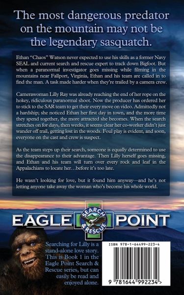 Ethan "Chaos" Watson never expected to use his skills as a former Navy SEAL and current search and rescue expert to track down Bigfoot. But when a paranormal investigator goes missing while filming in the mountains near Fallport, Virginia, Ethan and his team are called in to find the man. A task made harder when they're trailed by a camera crew. Camerawoman Lilly Ray was already reaching the end of her rope on the hokey, ridiculous paranormal shoot. Now the producer has ordered her to stick to the SAR team to get their every move on video. Admittedly not a hardship; she noticed Ethan her first day in town, and the more time they spend together, the more attracted she becomes. When the search stretches on for days, then weeks, it seems clear her co-worker didn't just wander off trail, getting lost in the woods. Foul play is evident, and soon, everyone on the cast and crew is suspect. As the team steps up their search, someone is equally determined to use the disappearance to their advantage. Then Lilly herself goes missing, and Ethan and his team will turn over every rock and leaf in the Appalachians to locate her...before it's too late. He wasn't looking for love, but it found him anyway-and he's not letting anyone take away the woman who's become his whole world. ** Searching for Lilly is the first book in the Eagle Point Search & Rescue Series. Each book is a stand-alone, with no cliffhanger endings.