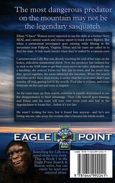 Ethan "Chaos" Watson never expected to use his skills as a former Navy SEAL and current search and rescue expert to track down Bigfoot. But when a paranormal investigator goes missing while filming in the mountains near Fallport, Virginia, Ethan and his team are called in to find the man. A task made harder when they're trailed by a camera crew. Camerawoman Lilly Ray was already reaching the end of her rope on the hokey, ridiculous paranormal shoot. Now the producer has ordered her to stick to the SAR team to get their every move on video. Admittedly not a hardship; she noticed Ethan her first day in town, and the more time they spend together, the more attracted she becomes. When the search stretches on for days, then weeks, it seems clear her co-worker didn't just wander off trail, getting lost in the woods. Foul play is evident, and soon, everyone on the cast and crew is suspect. As the team steps up their search, someone is equally determined to use the disappearance to their advantage. Then Lilly herself goes missing, and Ethan and his team will turn over every rock and leaf in the Appalachians to locate her...before it's too late. He wasn't looking for love, but it found him anyway-and he's not letting anyone take away the woman who's become his whole world. ** Searching for Lilly is the first book in the Eagle Point Search & Rescue Series. Each book is a stand-alone, with no cliffhanger endings.