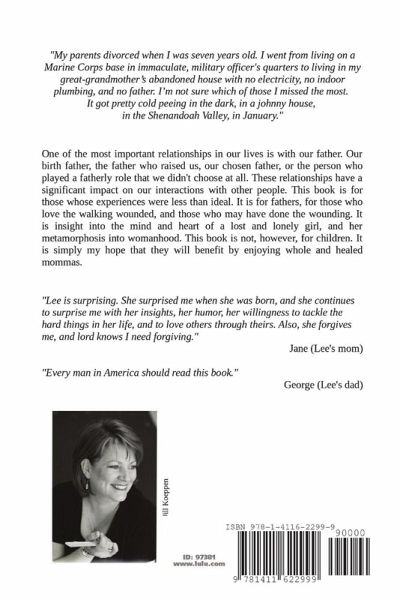 "My parents divorced when I was seven years old. I went from living in immaculate military officers quarters, to living in my great grandmother's house with no electricity, no indoor plumbing, and no father. I'm not sure which one I missed the most. It got pretty cold peeing in the dark, in a johnny house, in the Shenandoah Valley, in January."
