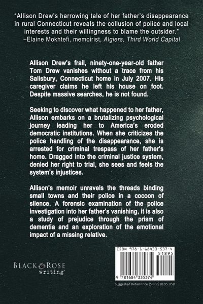 Amazon #1 Best Seller Organized Crime True Accounts Amazon #1 Best Seller Death & Grief Amazon #1 Best Seller Grief & Bereavement Allison Drew's frail, ninety-one-year-old father Tom Drew vanishes without a trace from his Salisbury, Connecticut home in July 2007. His caregiver claims he left his house on foot. Despite massive searches, he is not found. Seeking to discover what happened to her father, Allison embarks on a brutalizing psychological journey leading her to America's eroded democratic institutions. When she criticizes the police handling of the disappearance, she is arrested for criminal trespass of her father's home. Dragged into the criminal justice system, denied her right to trial, she sees and feels the system's injustices. Allison's memoir unravels the threads binding small towns and their police in a cocoon of silence. A forensic examination of the police investigation into her father's vanishing, it is also a study of prejudice through the prism of dementia and an exploration of the emotional impact of a missing relative.