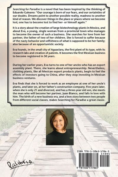 Searching for Paradise is a novel that has been inspired by the thinking of Eduardo Galeano: "Our courage is born of our fears, and our certainties of our doubts. Dreams point to another possible reality, madness to another kind of reason. We discover things in the place or places where we become lost; one has to become lost to find her- or himself again." It is a story about the creation of large biotechnology plants in Mexico, and about Eva, a young, single woman from a provincial town who manages to become the owner of such a business. She searches for love from her partner, the father of two of her children. She is forced to suffer because of the nasty behavior and selfishness of what is supposed to be her family; also because of an opportunistic society. Eva founds, in the small city of Aguaclara, the first plant of its type, with its research labs and creation of patents. It becomes the first Mexican business to become registered in 50 years. During her earlier years, Eva turns to one of her uncles who has an export assembly plant. There, she learns about entrepreneurship. Nevertheless, clothing plants, like all Mexican export products plants, begin to feel the effects of investors going to China, after they stop investing in Mexican business ventures. Eva finds that she is forced to work as an employee at one of her uncle’s plants, and later on, at her father’s construction company. Five years later, when she is only 21 and divorced, and has a three-year old son, she meets the man who will become her partner, Juan Blanco, and falls in love with him. The birth of a new business era, and a love story between two people from different social classes, makes Searching for Paradise a great classic.