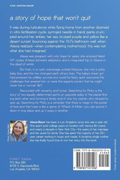 It was during turbulence while flying home from another doomed In Vitro Fertilization cycle, syringed needle in hand, pants crumpled around her ankles, her ass, bruised purple and yellow like a desert sunset, bouncing against the 747's bathroom wall, when Alexia realized - when contemplating motherhood, this was not what I had imagined. Alexia was pregnant with only hope for years, enduring failed IVF cycles, ill-fated domestic adoptions, and a misguided trip to Siberia before meeting a sickly baby in a rustic orphanage outside Moscow. The baby's sheer grit had powered his unlikely survival, but could his feisty spirit overcome the challenges that awaited him, or were the experts correct that he might never live a 'normal' life? Recounted with sincerity and humor, Searching for Pinky is the story of two equally determined spirits on opposite sides of the planet finding each other to form a Family, and of one tiny orphan defying dire predictions to become an unwitting poster child for the notion of never giving up; Pinky... is a reminder that there is magic in the power of love and that Hope is like a game of Whack A Mole - you can pound it down in one place and up it pops in another.