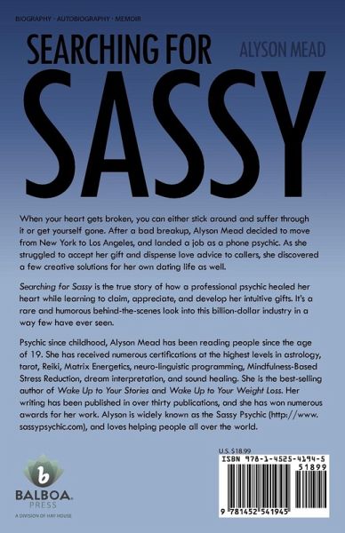 When your heart gets broken, you can either stick around and suffer through it, or get yourself gone. Alyson Mead decided to move from New York to Los Angeles to take a job as a phone psychic after a bad breakup. But as she struggles so accept her gift, while dispensing love advice to daily callers, her own dating life proves to be less than glamorous. Searching for Sassy tells the true story of how a professional psychic healed her heart and got back on track, while learning to claim, appreciate, and develop her gifts. It's a rare and humorous behind-the-scenes look into this billion-dollar industry, in a way few have ever seen. Mead's path to healing may have been different than most. But this book is for anyone who's ever felt a little different, and maybe a tad challenged in the love department.