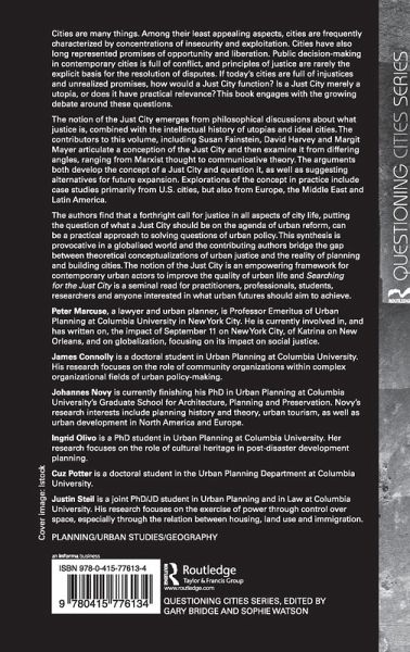 Cities are many things. Among their least appealing aspects, cities are frequently characterized by concentrations of insecurity and exploitation. Cities have also long represented promises of opportunity and liberation. Public decision-making in contemporary cities is full of conflict, and principles of justice are rarely the explicit basis for the resolution of disputes. If today's cities are full of injustices and unrealized promises, how would a Just City function? Is a Just City merely a utopia, or does it have practical relevance? This book engages with the growing debate around these questions. The notion of the Just City emerges from philosophical discussions about what justice is combined with the intellectual history of utopias and ideal cities. The contributors to this volume, including Susan Fainstein, David Harvey and Margit Mayer articulate a conception of the Just City and then examine it from differing angles, ranging from Marxist thought to communicative theory. The arguments both develop the concept of a Just City and question it, as well as suggesting alternatives for future expansion. Explorations of the concept in practice include case studies primarily from U.S. cities, but also from Europe, the Middle East and Latin America. The authors find that a forthright call for justice in all aspects of city life, putting the question of what a Just City should be on the agenda of urban reform, can be a practical approach to solving questions of urban policy. This synthesis is provocative in a globalised world and the contributing authors bridge the gap between theoretical conceptualizations of urban justice and the reality of planning and building cities. The notion of the Just City is an empowering framework for contemporary urban actors to improve the quality of urban life and Searching for the Just City is a seminal read for practitioners, professionals, students, researchers and anyone interested in what urban futures should aim to achieve.