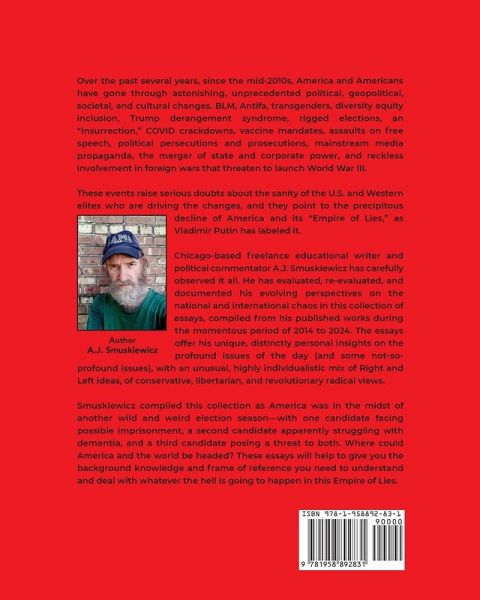 Over the past several years, since the mid-2010s, America and Americans have gone through astonishing, unprecedented political, geopolitical, societal, and cultural changes. BLM, Antifa, transgenders, diversity equity inclusion, Trump derangement syndrome, rigged elections, an "insurrection," COVID crackdowns, vaccine mandates, assaults on free speech, political persecutions and prosecutions, mainstream media propaganda, the merger of state and corporate power, and reckless involvement in foreign wars that threaten to launch World War III. These events raise serious doubts about the sanity of the U.S. and Western elites who are driving the changes, and they point to the precipitous decline of America and its "Empire of Lies," as Vladimir Putin has labeled it. Chicago-based freelance educational writer and political commentator A.J. Smuskiewicz has carefully observed it all. He has evaluated, re-evaluated, and documented his evolving perspectives on the national and international chaos in this collection of essays, compiled from his published works during the momentous period of 2014 to 2024. The essays offer his unique, distinctly personal insights on the profound issues of the day (and some not-so-profound issues), with an unusual, highly individualistic mix of Right and Left ideas, of conservative, libertarian, and revolutionary radical views. Smuskiewicz compiled this collection as America was in the midst of another wild and weird election season-with one candidate facing possible imprisonment, a second candidate apparently struggling with dementia, and a third candidate posing a threat to both. Where could America and the world be headed? These essays will help to give you the background knowledge and frame of reference you need to understand and deal with whatever the hell is going to happen in this Empire of Lies.