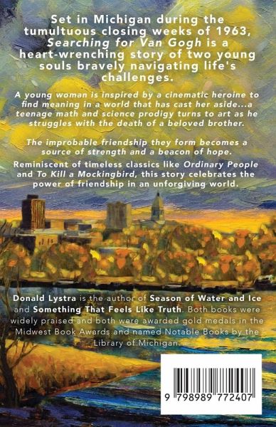 Award-winning author Donald Lystra brings us an unforgettable tale of love, loss, and self-discovery, capturing the turbulent spirit of 1960s America and the uncharted territory of the human heart. Searching for Van Gogh is a stirring novel set in 1963 in America's industrial Midwest. Nate, a young man with a gift for math and science, rejects a comfortable future by walking away from college to pursue painting-a desperate attempt to access the emotions buried deep within him following the tragic death of his revered older brother. But Nate's search for meaning is lonely and frustrating until he meets Audrey Brubaker, a paradox of strength and vulnerability, who becomes a sort of mentor to Nate, guiding him toward self-discovery. But in the end it is Audrey who will ultimately need Nate's emotional insight, and in a devastating turn, she seeks redemption in the most unexpected way-forcing Nate to tap into the very depths of empathy and courage she's helped him to uncover.