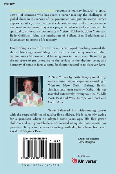 A New Yorker by birth, Terry has gathered forty years of international experience in both the private sector and government where he resided in Poland, India, Lebanon, Berlin, Saudi Arabia, and most recently Afghanistan. He has traveled extensively throughout the Middle East, East and West Europe, and East and South Asia on assignment. His poetry reflects an inner journey that is anchored in centering prayer - a prayer of silence and meditation. He counts among his guides Meister Eckhardt, John Main, Bede Griffiths, Jalaluddin Rumi, and Thomas Merton. His many years residing abroad fueled his curiosity as he explored Buddhist, Sufi, Shamanic, and Zen spirituality. Terry has balanced his wide-ranging career with the responsibilities of raising five children. He is currently responsible for a grandson, Chris, whom he adopted and lives with him. He regularly visits his five grown children and ten grandchildren located along the East Coast. For pleasure, Terry can be seen cavorting with dolphins from his ocean kayak launched from his Sandbridge, Virginia home.