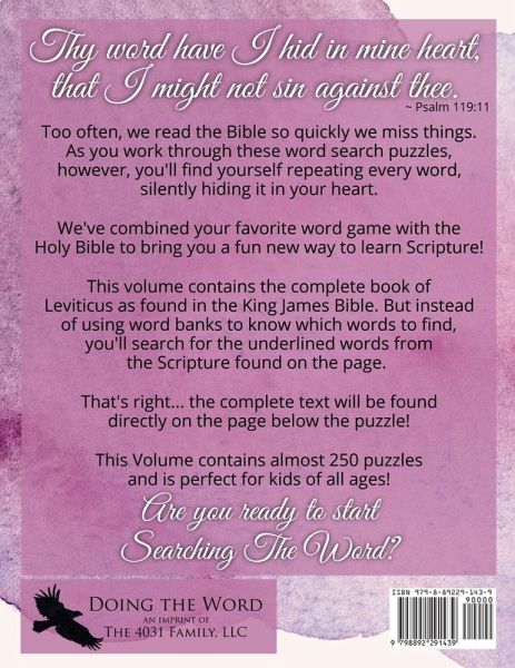 Immerse yourself in the sacred text of Leviticus like never before with Searching the Word: Leviticus, featuring the complete text from the King James Version! Embark on a fascinating journey through the intricate laws, rituals, and teachings of Leviticus while engaging in entertaining word search puzzles. Each page seamlessly weaves together the words of Leviticus with brain-teasing challenges, offering a unique opportunity to explore scripture in a fun and interactive way. Delve into the depths of Leviticus as you search for the words of its commandments, and sacred rituals. Whether you're a puzzle aficionado, a devoted student of scripture, or someone looking for a fresh approach to spiritual study, this book promises hours of enjoyment and enlightenment. Searching the Word: Leviticus is perfect for quiet moments of reflection, Bible study groups, or as a thoughtful gift for friends and loved ones. Don't miss this chance to deepen your understanding of Leviticus while sharpening your mind with stimulating puzzles. Experience the perfect blend of entertainment and spiritual exploration-order your copy of Searching the Word: Leviticus today and embark on a rewarding journey through the pages of both puzzles and scripture! 352 pages, 297 puzzles