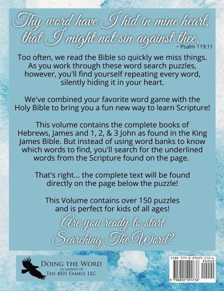 Delve into the depths of faith, practical wisdom, and Christian love with Searching the Word: Hebrews, James, and 1 , 2, & 3 John, featuring the complete text from the King James Bible! Explore the profound insights, practical teachings, and intimate exhortations found within these epistles while engaging in stimulating word search puzzles. Each page seamlessly integrates the profound words of Hebrews, James, 1 John, 2 John, and 3 John with entertaining puzzles, offering a unique blend of entertainment and spiritual enrichment. Delve into themes of faith in Christ's sacrifice, the relationship between faith and works, Christian fellowship, and the importance of love as you search for hidden words that reflect the messages and teachings of these epistles. Whether you're a puzzle enthusiast, a devoted Bible reader, or simply seeking a fresh way to engage with scripture, Searching the Word: Hebrews, James, and 1, 2, & 3 John is sure to captivate and inspire. Perfect for personal reflection, Bible study groups, or as a thoughtful gift for friends and family, these books provide an opportunity to deepen your understanding of Christian doctrine and practice while sharpening your mind through entertaining puzzles. Experience the perfect blend of entertainment and spiritual exploration-order your copy of Searching the Word: Hebrews, James, and 1, 2, & 3 John today and embark on an unforgettable journey through the pages of both puzzles and scripture!