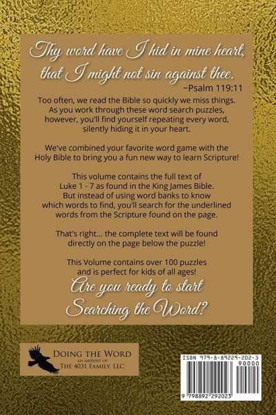 Explore the life and teachings of Jesus as told by the Gospel of Luke with Searching Through Luke, a three-volume word search book series that features the entire text of Luke's gospel from the King James Bible as the puzzle grid. Immerse yourself in the rich detail and compassionate stories of Luke as you search for specific words and phrases embedded within the scripture itself. From the parables of the Good Samaritan and the Prodigal Son to the events of Christ's birth and resurrection, every chapter provides a unique opportunity to engage with God's Word in a fresh and interactive way. Perfect for personal devotion, Bible study groups, or as a thoughtful gift, Searching Through Luke offers a meaningful blend of biblical study and puzzle-solving fun. Whether you're seeking to grow in your faith or enjoy a relaxing and enriching activity, this series invites you to discover the timeless truths of scripture one word search at a time. Order Volumes 1, 2, and 3 of Searching Through Luke today and experience the Gospel in a whole new way!