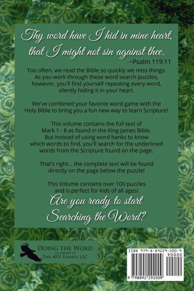Explore the ministry and message of Jesus through the Gospel of Mark with Searching Through Mark, a two-volume word search book series that features the entire text of Mark's gospel from the King James Bible as the puzzle grid. Immerse yourself in the fast-paced and powerful narratives of Mark as you search for specific words and phrases embedded within the scripture itself. From the miracles of Jesus to His ultimate sacrifice, every chapter provides a meaningful opportunity to engage with God's Word in a fresh and interactive way. Perfect for personal devotion, Bible study groups, or as a thoughtful gift, Searching Through Mark offers a unique blend of biblical study and puzzle-solving fun. Whether you're seeking to deepen your faith or enjoy an enriching activity, this series invites you to discover the timeless truths of scripture one word search at a time. Order Volumes 1 and 2 of Searching Through Mark today and experience the Gospel in a whole new way!