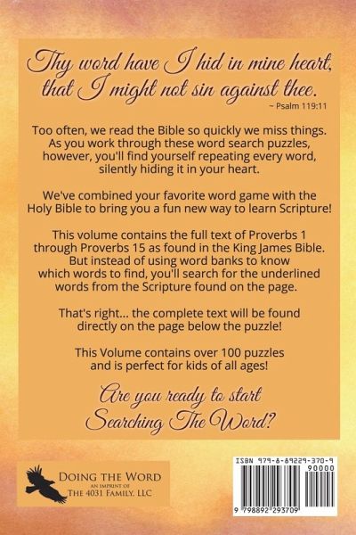 Unlock the timeless wisdom of the Book of Proverbs with Searching Through Proverbs. Unlike traditional word search puzzles, this series utilizes the entire text of the Book of Proverbs from the King James Bible as the word bank for each puzzle. Each volume in the series challenges you to search for specific words within the text. Delve into the profound insights, practical advice, and moral teachings of Proverbs while sharpening your mind. Whether you're seeking moments of reflection, spiritual growth, or simply a fun and challenging puzzle experience, Searching Through Proverbs offers something for everyone. Perfect for individuals, families, and Bible study groups, this series provides a unique opportunity to deepen your understanding of Proverbs while enjoying the excitement of solving word search puzzles. Experience the joy of discovering hidden treasures within the wisdom literature of the Bible and embark on a journey of spiritual enrichment with Searching Through Proverbs. Start exploring the depths of Proverbs today!