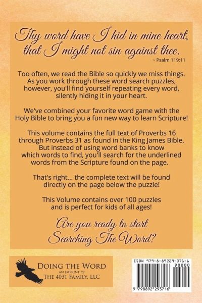 Unlock the timeless wisdom of the Book of Proverbs with Searching Through Proverbs. Unlike traditional word search puzzles, this series utilizes the entire text of the Book of Proverbs from the King James Bible as the word bank for each puzzle. Each volume in the series challenges you to search for specific words within the text. Delve into the profound insights, practical advice, and moral teachings of Proverbs while sharpening your mind. Whether you're seeking moments of reflection, spiritual growth, or simply a fun and challenging puzzle experience, Searching Through Proverbs offers something for everyone. Perfect for individuals, families, and Bible study groups, this series provides a unique opportunity to deepen your understanding of Proverbs while enjoying the excitement of solving word search puzzles. Experience the joy of discovering hidden treasures within the wisdom literature of the Bible and embark on a journey of spiritual enrichment with Searching Through Proverbs. Start exploring the depths of Proverbs today!