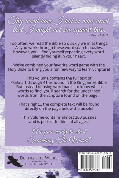 Too often, we read through the Bible so quickly we miss things. We think we know what it says, but God's word is "quick, and powerful, and sharper than any two-edged sword" (Hebrews 4:12). Careful reading often takes us by surprise, revealing layers of profound meaning and insight where we had previously just seen "a story." Here, we present the book of Psalms in a format designed to encourage you to "meditate therein day and night" (Joshua 1:8). These word-search puzzles, with the full text of Scripture on every page, will have you silently repeating each word as you search for them in the puzzle grids. These five volumes will walk you through all 150 Psalms in a convenient 6" x 9" format. We hope this helps you to join the psalmist in saying "Thy word have I hid in my heart, That I might not sin against thee." (Psalm 119:11)