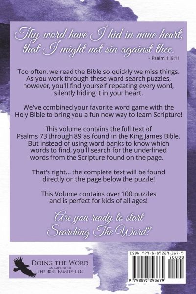 Too often, we read through the Bible so quickly we miss things. We think we know what it says, but God's word is "quick, and powerful, and sharper than any two-edged sword" (Hebrews 4:12). Careful reading often takes us by surprise, revealing layers of profound meaning and insight where we had previously just seen "a story." Here, we present the book of Psalms in a format designed to encourage you to "meditate therein day and night" (Joshua 1:8). These word-search puzzles, with the full text of Scripture on every page, will have you silently repeating each word as you search for them in the puzzle grids. These five volumes will walk you through all 150 Psalms in a convenient 6" x 9" format. We hope this helps you to join the psalmist in saying "Thy word have I hid in my heart, That I might not sin against thee." (Psalm 119:11)