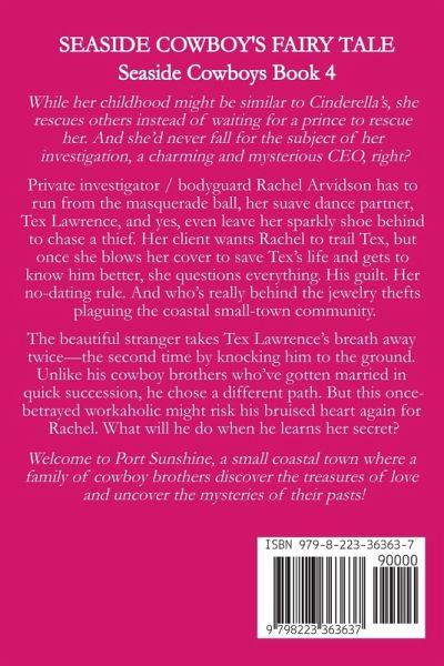 While her childhood might be similar to Cinderella's, she rescues others instead of waiting for a prince to rescue her. And she'd never fall for the subject of her investigation, a charming and mysterious CEO, right? Private investigator / bodyguard Rachel Arvidson has to run from the masquerade ball, her suave dance partner, Tex Lawrence, and yes, her sparkly shoe behind to chase a thief. Then her client wants Rachel to trail Tex. Once she blows her cover to save Tex's life and gets to know him better, she questions everything. His guilt. Her no-dating rule. And who's really behind the jewelry thefts plaguing the coastal small-town community. The beautiful stranger takes Tex Lawrence's breath away twice-the second time by knocking him to the ground. Unlike his cowboy brothers who've gotten married in quick succession, he chose a different path. But this once-betrayed workaholic might risk his bruised heart again for Rachel. What will he do when he learns her secret?